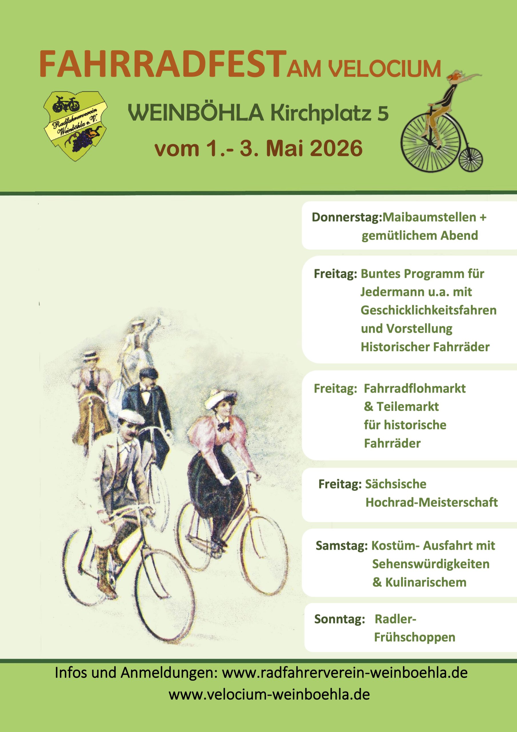Der Radfahrerverein und das VELOCIUM Weinböhla laden wieder zum Fahrradfest ein. Es wird ein buntes Programm sowie eine Tagesausfahrt geben. Für Frühankömmlinge gibt es bereits am Donnerstag ein Treffen am VELOCIUM, mit einem Abstecher zum Maibaumstellen. Der 1. Mai beginnt mit Fahrradflohmarkt, Vorstellung von historischen Fahrrädern, kleinen Radrennen, einem buntem Programm und kleinem Fahrradfest für Jedermann. Die Kostümausfahrt mit historischen Fahrrädern führt uns am Samstag durch flaches Gelände in das Elbtal, mit Sehenswürdigkeiten & Kulinarischem. Am Sonntag lassen wir die Veranstaltung bei einem Radlerfrühschoppen ausklingen. Im VELOCIUM kann man zusätzlich die Sonderausstellung Friedensfahrt – die Tour de France des Ostens besichtigen.
